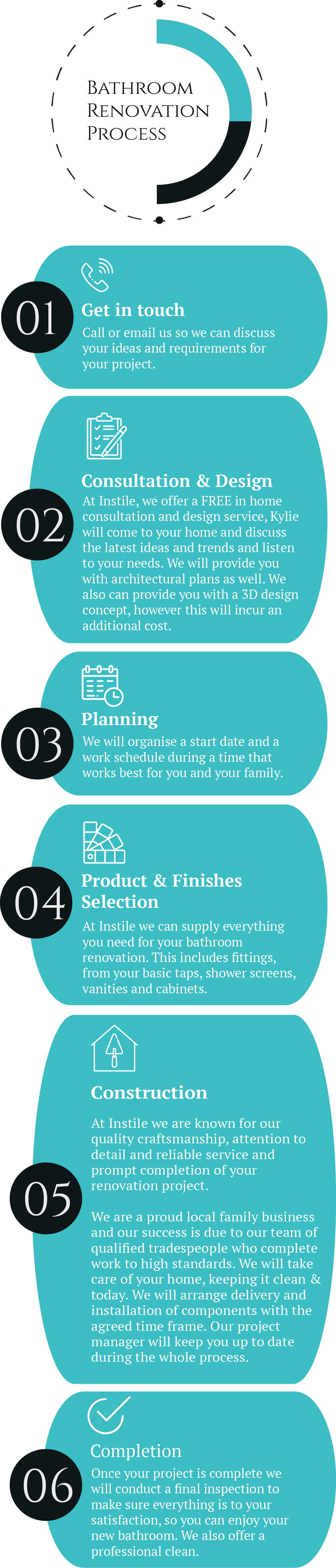 Instile offers a professional approach that is unmatched, starting with the initial free in-home design consultation and continuing through the bathroom renovation's completion and after-sales care.